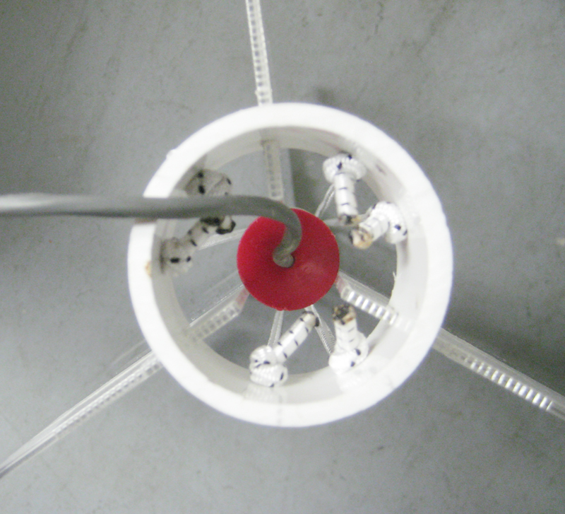 The basic design is two PVC caps that snap onto acrylic vanes – the caps are connected by bungee cords that perfectly hold the vanes in place while allowing for quick and easy assembly and dis-assembly. The vanes then fit tightly in a 10″ funnel held onto the 2 gallon bucket by shortened mini-bungees. Any UV bulb can then be dropped into the vane assembly (in this case a BioQuip light). The diameter of the vane opening at the bottom is slightly narrower than at the top, providing a very snug cavity for the bulb. Cardboard egg cartons or towel padding has to be added to the bucket to provide insect resting area.